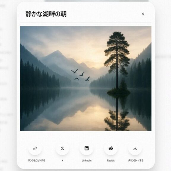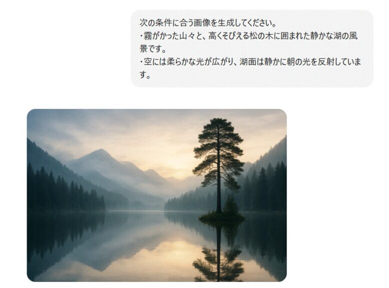 ■プロンプト例 次の条件に合う画像を生成してください。 ・霧がかった山々と、高くそびえる松の木に囲まれた静かな湖の風景です。 ・空には柔らかな光が広がり、湖面は静かに朝の光を反射しています。 |