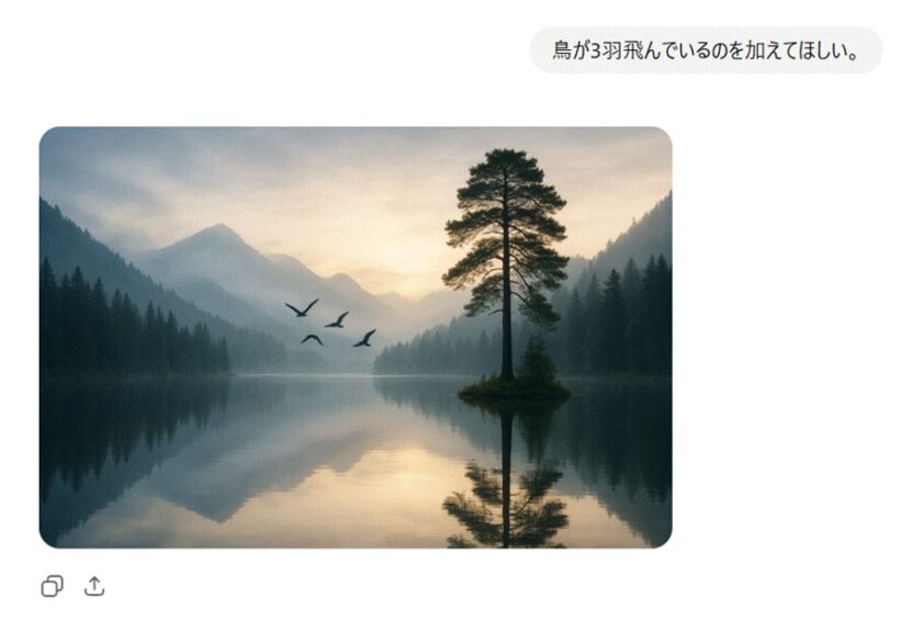 ■プロンプト例 鳥が3羽飛んでいるのを加えてほしい。 |