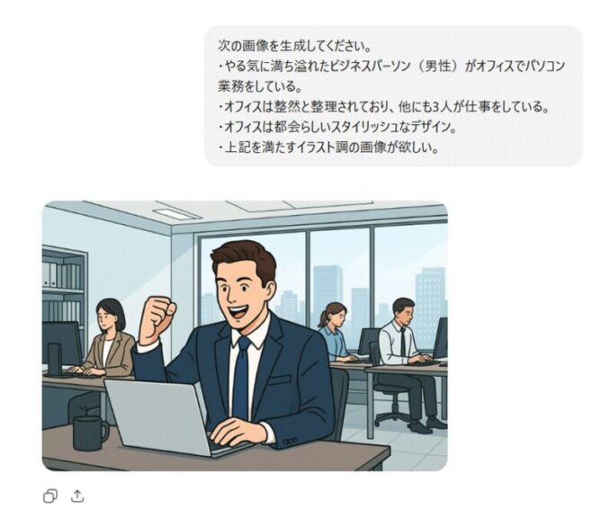 ■プロンプト例 次の条件に合う画像を生成してください。 ・やる気に満ち溢れたビジネスパーソン(男性)がオフィスでパソコン業務をしています。 ・オフィスは整然と整理されており、他にも3人が仕事をしています。 ・オフィスは都会らしいスタイリッシュなデザインです。 ・上記を満たすイラスト調の画像にしてほしいです。 |