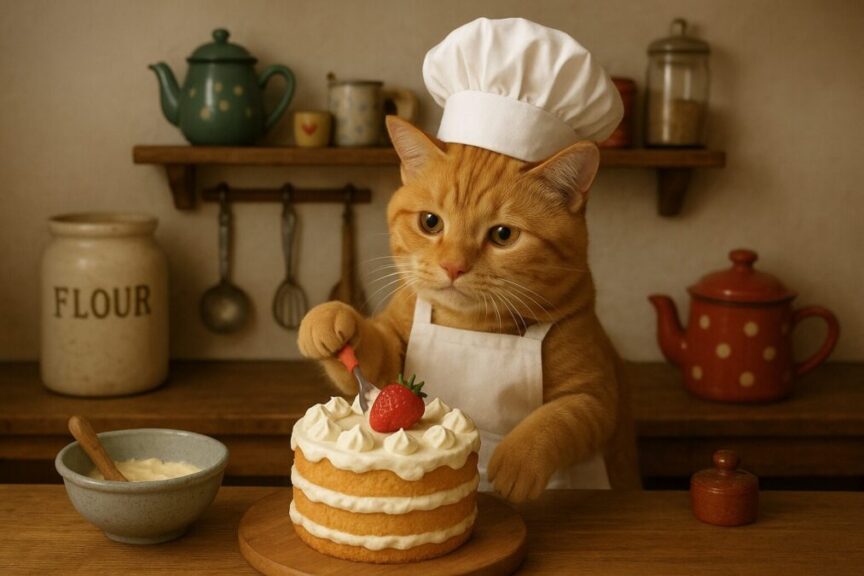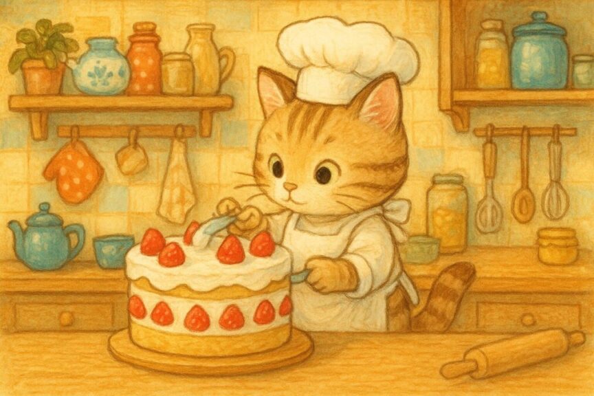プロンプト例 次の条件に合う画像を生成してください。 ・かわいい猫のシェフが大きなケーキを一生懸命に作っています ・絵本のような世界観で雑貨がたくさんあるキッチンです ・横位置でお願いします |