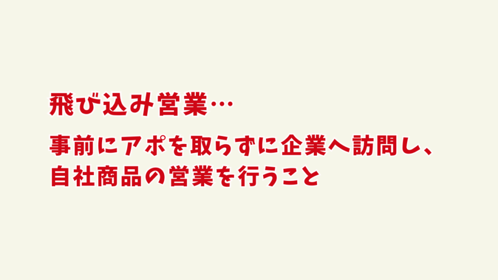 飛び込み営業とは、事前にアポイントを取らずに企業へ訪問し、自社商品の営業を行うことをいいます。