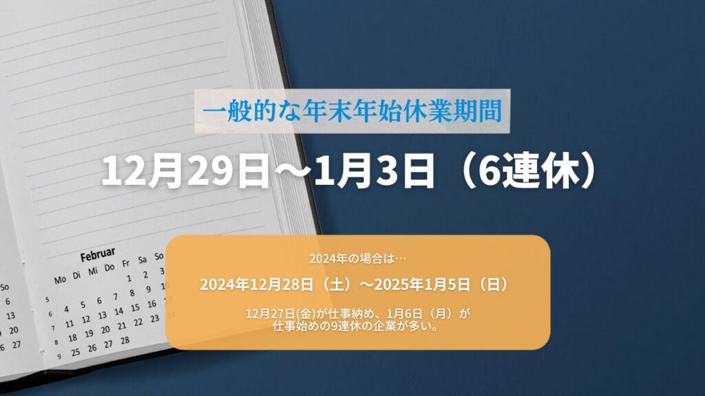 今年の年末年始(2024年末~2025年始)の休業期間はいつからいつまでが一般的なのでしょうか?