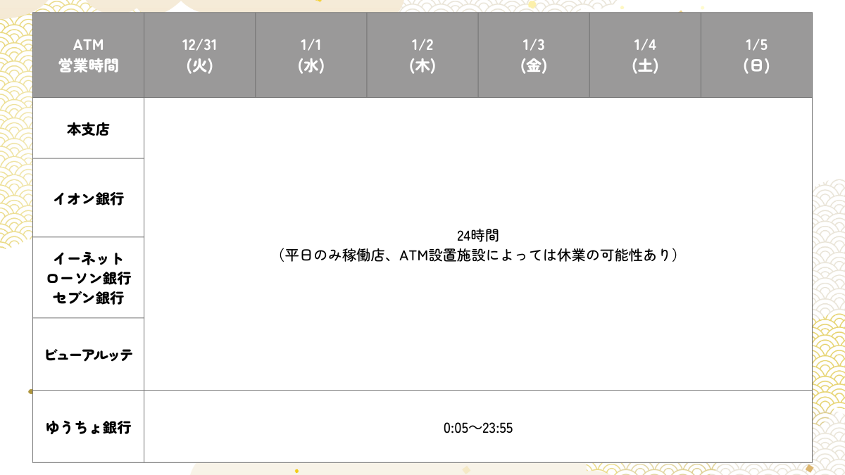 参考:ゆうちょ銀行「年末年始における各種サービスの取り扱いについて~ATMは年末年始もご利用いただけます~」