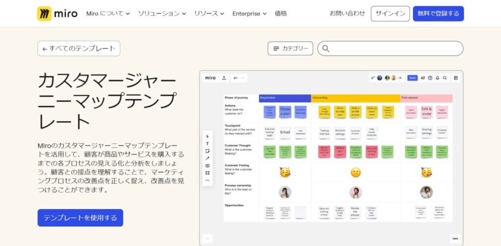 カスタマージャーニーマップテンプレートが用意されているので、各プロセスごとの施策を書き込んでいくだけでカスタマージャーニーマップが完成します。オンラインで共有しながら、複数人で同時に編集できるのも魅力です。