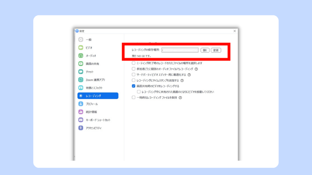 Zoom画面の右上の歯車アイコンをクリックして設定画面を開き、レコーディング欄の「レコーディングの保存場所」を変更します。