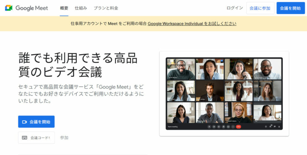 | ・Googleアカウントがあれば無料で利用できる ・英語字幕機能がある ・録画は有料プランでのみ利用可能 ・画面共有、バーチャル背景機能がある ・最大100人とビデオ会議が可能 ・ビデオ会議だけではなくGoogle の様々な機能が利用できる |