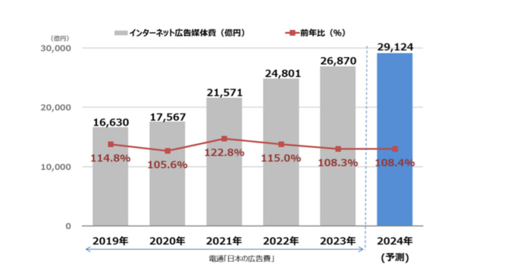 2023年のインターネット広告費は前年比108.3%の成長が見られました。2024年もさらに市場の拡大が見込まれ、2兆9,124億円に達すると予想されています。特にビデオ(動画)広告の大きな伸びが期待できます。