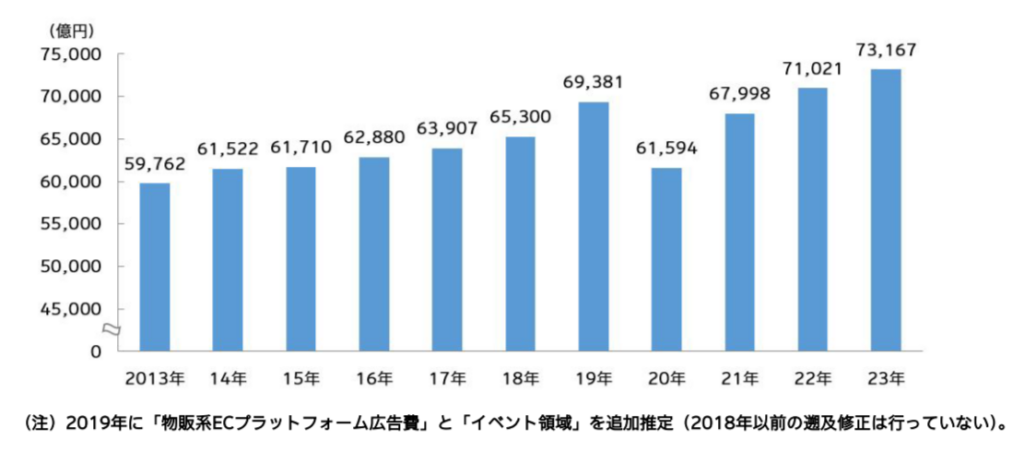 電通の発表によると、2023年の日本の総広告費は7兆3,167億円、前年比103%で過去最高額になったそうです。