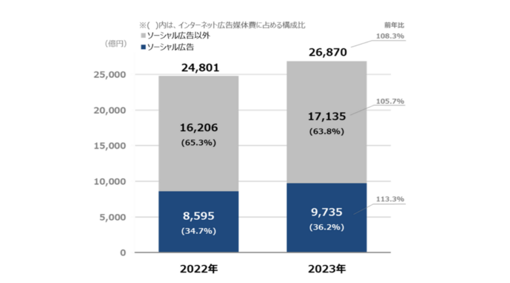 2023年のソーシャル広告の費用は前年比113.3%増加し、9,735億円に達しています。これはインターネット広告費全体の36.2%を占めるほどです。