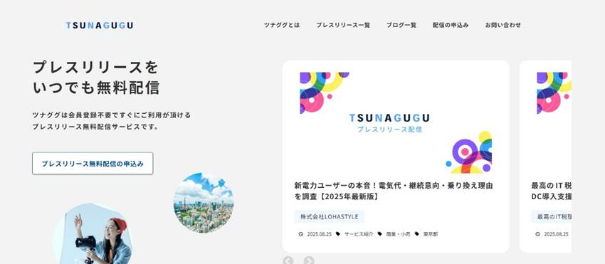 TSUNAGUGU(ツナググ)は毎月5本まで無料で利用できるプレスリリース配信サービスです。ユーザー登録が不要で、投稿フォームに情報を登録するだけでプレスリリースを配信できます。PR-FREEとは異なり、見出し画像や記事内画像を挿入できます。