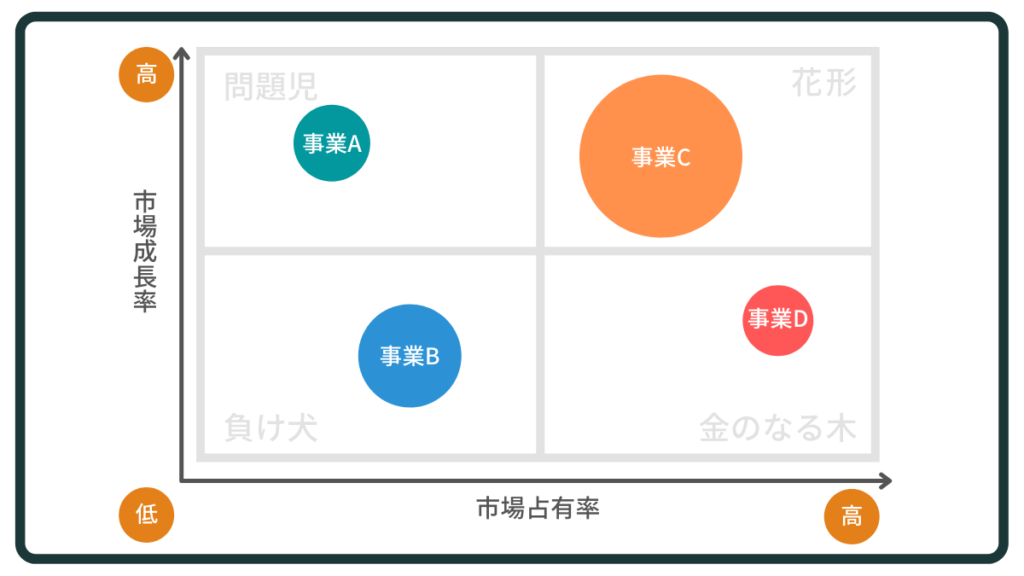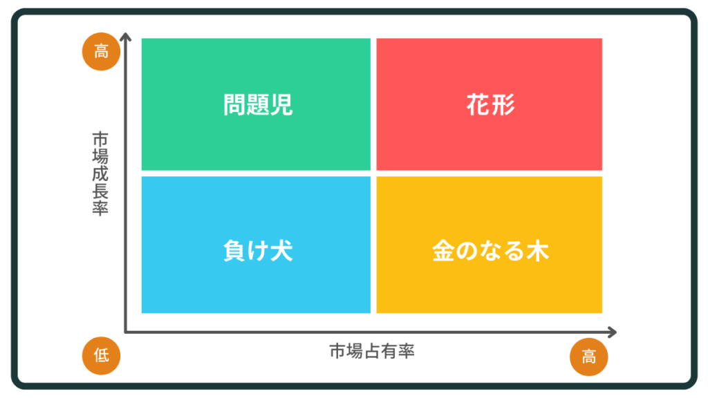 市場の成長率と市場の占有率を主たる2軸として設定し、座標に対して事業・製品・サービスを的確に分類することにより、経営資源に関する投資配分が判断できるというものです。