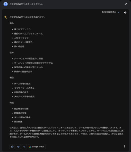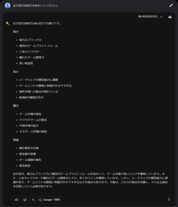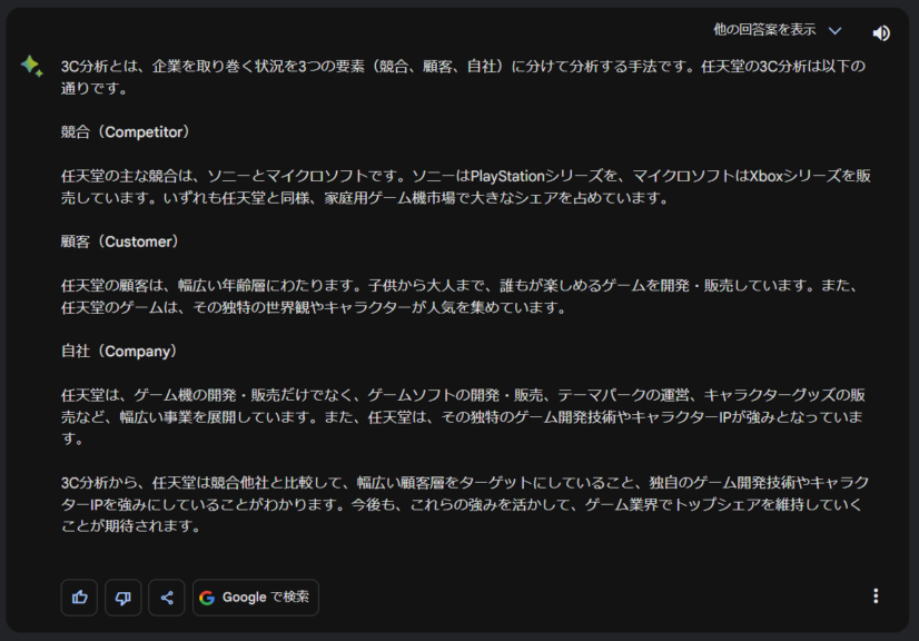 例えばBardに「任天堂を3C分析してください」と質問すると以下のような解答が返ってきました。