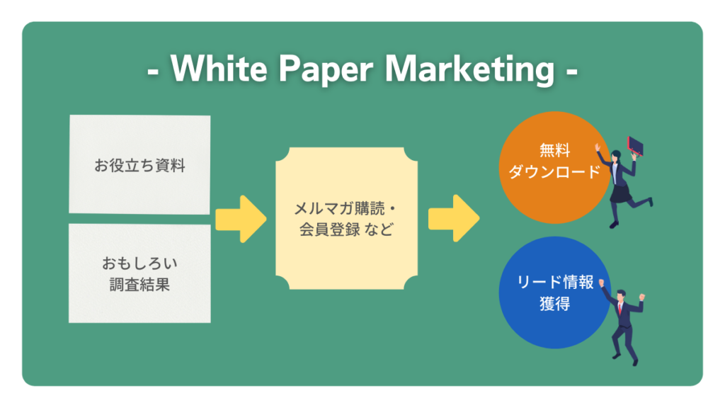 ホワイトペーパーはリードジェネレーションの施策として活用されることも多く、ホワイトペーパーのダウンロードと引き換えに企業情報や連絡先などの情報を得るという手法が一般的です。