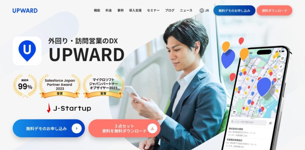 UPWARDはスケジュール管理、地図表示、位置情報活用などの機能をスマートフォンから利用できるようにした営業支援特化型のクラウド顧客管理システムです。