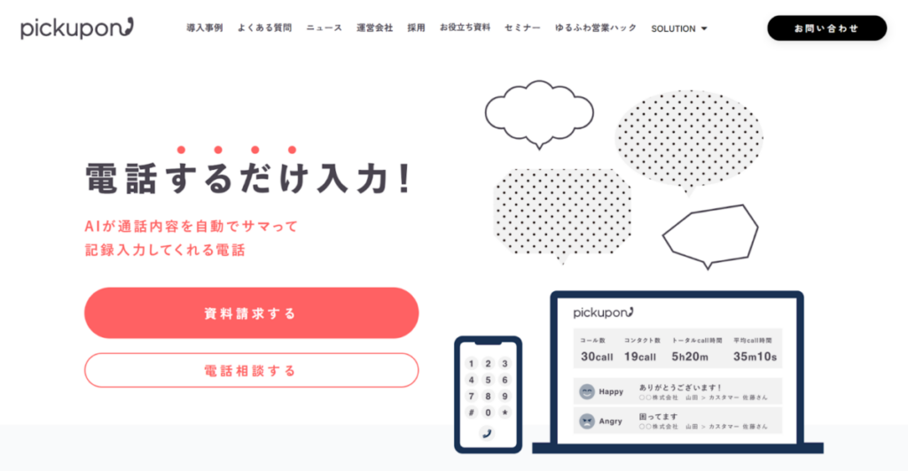 pickuponは通話内容を自動で文字起こしができるクラウドIP電話です。AIが通話内容から重要な箇所を抽出してくれるため、会話に集中することができます。