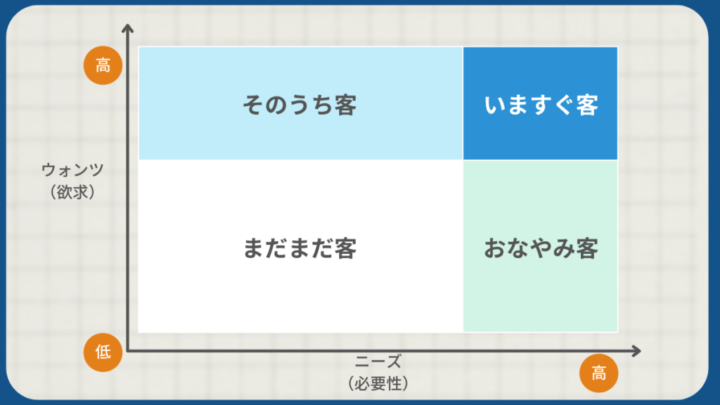 潜在顧客と見込み顧客の違いは、「ニーズ」と「ウォンツ」の状況で分類することもできます。