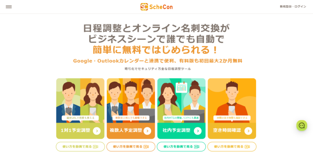スケコンは日程調整&オンライン名刺交換サービスです。フリープランなら月8回までの日程調整(成立時のみ)が無料。連携できるツールが多いので、シームレスに使えるのが魅力です。