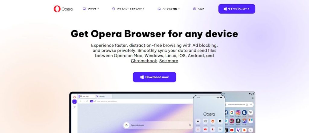 Operaは、25年以上の歴史があるWebブラウザです。主な特長は次のとおりです。