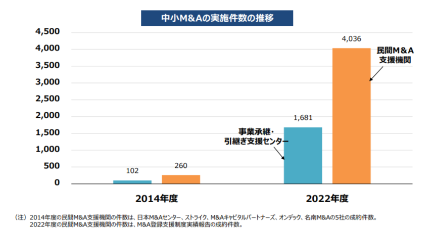 経済産業省がまとめた『事業承継・M&Aに関する現状分析と今後の取組の方向性について』では、国内の中小企業ではM&Aの実施件数が8年間で10倍以上増加していると述べられています。