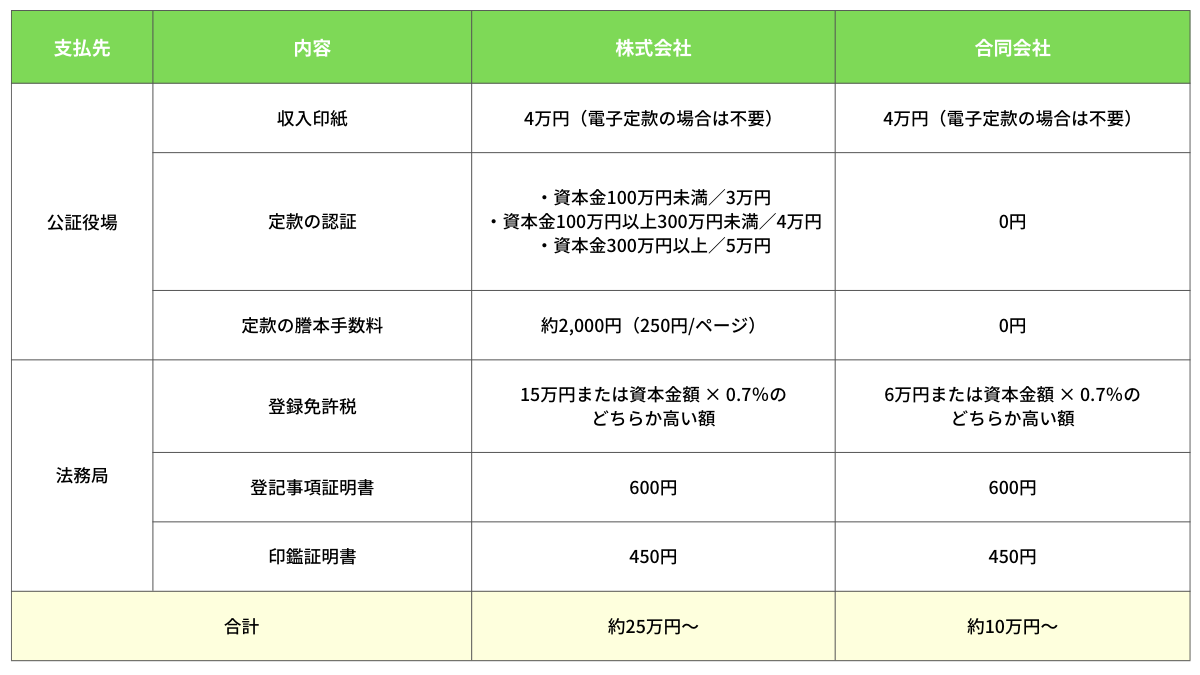 定款認証手数料3〜5万円、収入印紙代4万円(電子認証の場合0円)が別途必要です。
