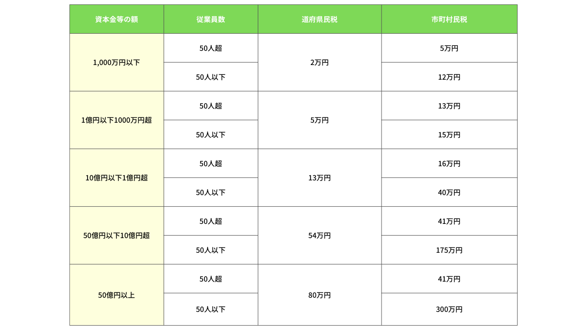 例えば、従業員50人以下で資本金1,000万円以下の場合は7万円ですが、資本金が1,000万円を超えると18万円になります。