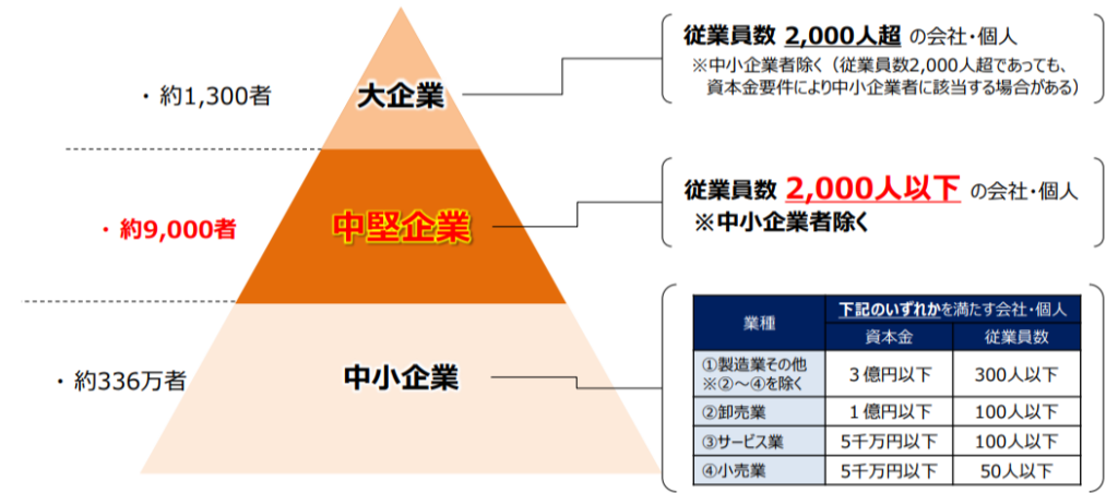 中堅企業とは、経済産業省の定義によると中小企業を除き、常時使用する従業員数が2,000人以下の企業を指します。