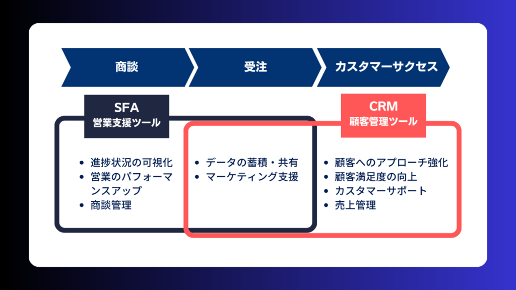 わかりやすく説明すると、ユーザーが注文に至るまでの営業をサポートするのがSFA、注文後からのカスタマーサポートを担うのがCRMです。
