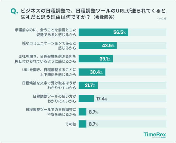 次いで、「雑なコミュニケーションであると感じるから」「URLを開き、日程候補を選ぶ負担を押しつけられているように感じるから」「上下関係を感じるから」という理由が多いようです。