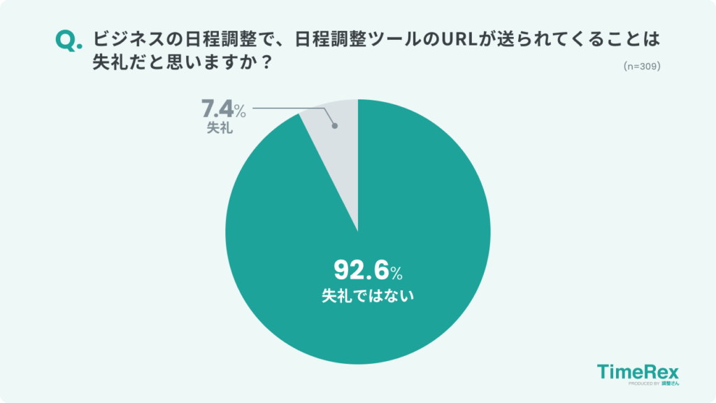 「ビジネスの日程調整で、日程調整ツールのURLが送られてくることは失礼だと思いますか?」という質問に対しては、92.6%の人が「失礼ではない」と回答しています。