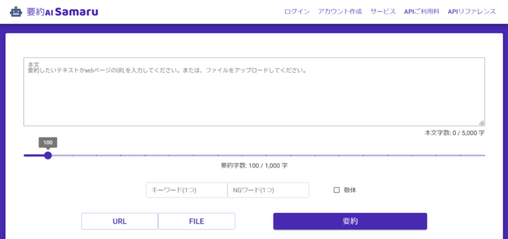キーワードやNGワードの指定、敬体(ですます調)にするかどうかの指定、要約文字数の指定もできます。ただし、入力文字数は5,000文字までと限られています。