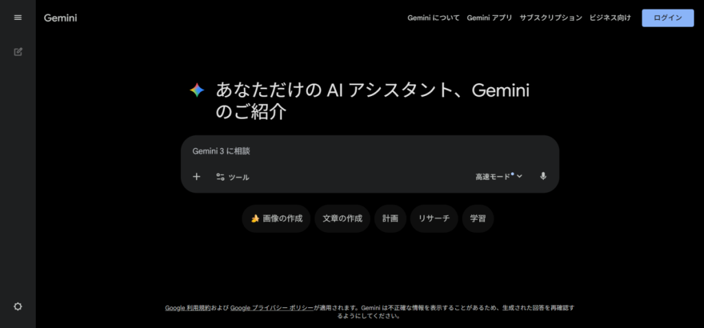 Geminiも無料版があり、特にGoogleアカウントを持っているユーザーには使いやすい設計になっています。多機能でありながら、シンプルなインターフェースが特徴です。商用利用については明記されていませんでした。