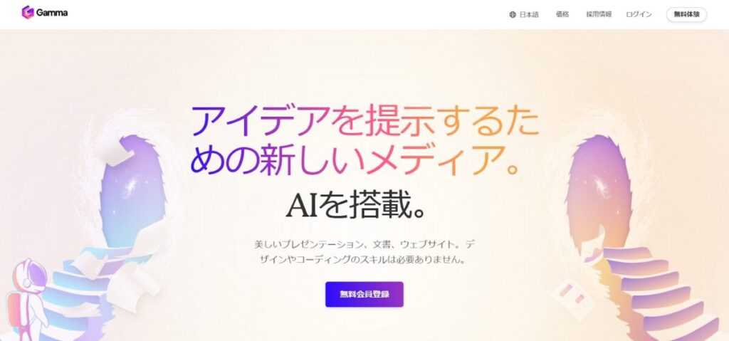 Gamma(ガンマ)は、さまざまなテンプレートを使用して自動的にスライドを作成するAIツールです。シンプルなインターフェースで、初心者でも簡単に使えると評判です。プレゼン資料の作成を迅速に行えるため、時間の節約にもつながります。