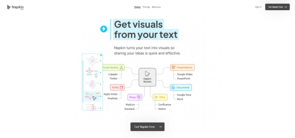 Napkin(ナプキン) AIは、テキストを視覚的な図解やグラフに変換するAIツールで、特に日本語対応が強化されている点が特徴です。AIが自動的にフローチャートやグラフなどの図解を生成するため、特別なデザインスキルは不要です。