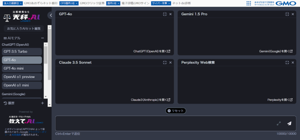 GPT-4o、Claude 3.5、Gemini1.5、Perplexityなどの最新のAIツールを選んで、同時に実行できるのが強みです。回答を比較、または統合することで、より良い結果を得ることができます。
