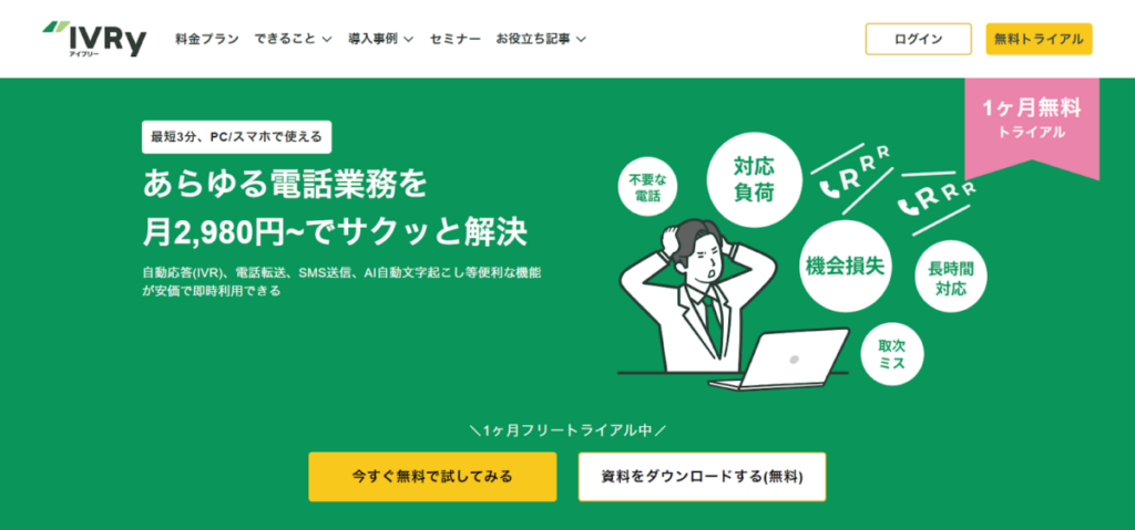 IVRy(アイブリー)は、月額2,980円から利用できる電話自動応答システムです。音声ガイダンスや自動受付機能を備えており電話対応を効率化できます。