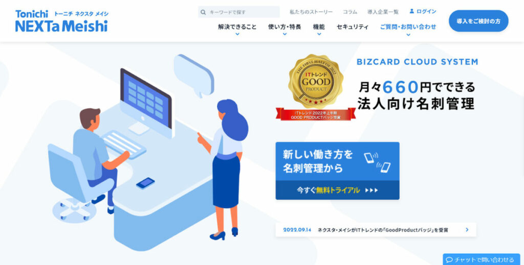 Tonichi NEXTa Meishiは最大2ヵ月無料で試せる名刺管理アプリです。豊富な機能が魅力で、名刺管理や自動名寄せ、経歴表示やメモ書きなどがあります。
