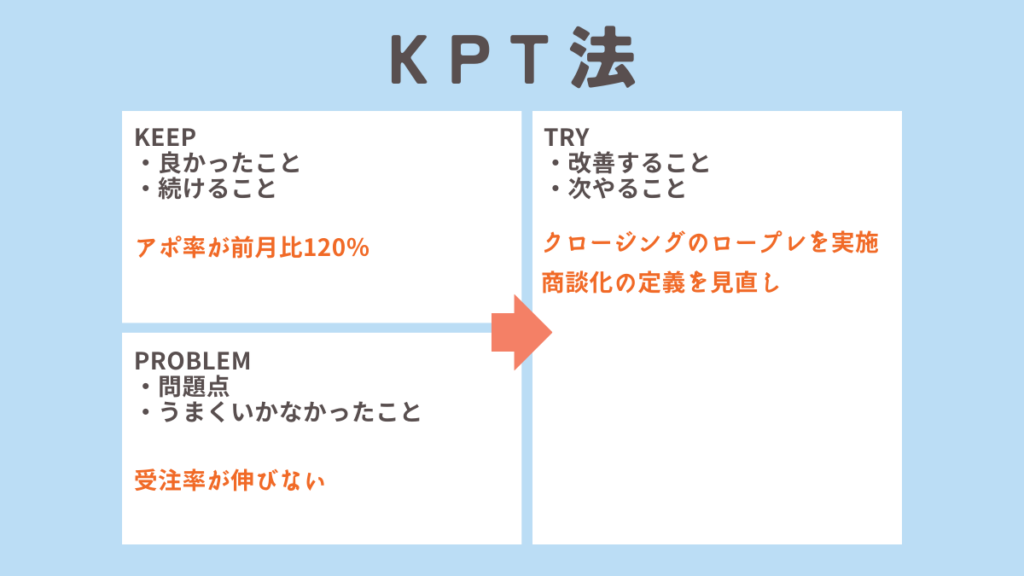 KPT法とは、「Keep(持続)」「Problem(問題)」「Try(挑戦)」の頭文字から名付けられた振り返りのフレームワークです。