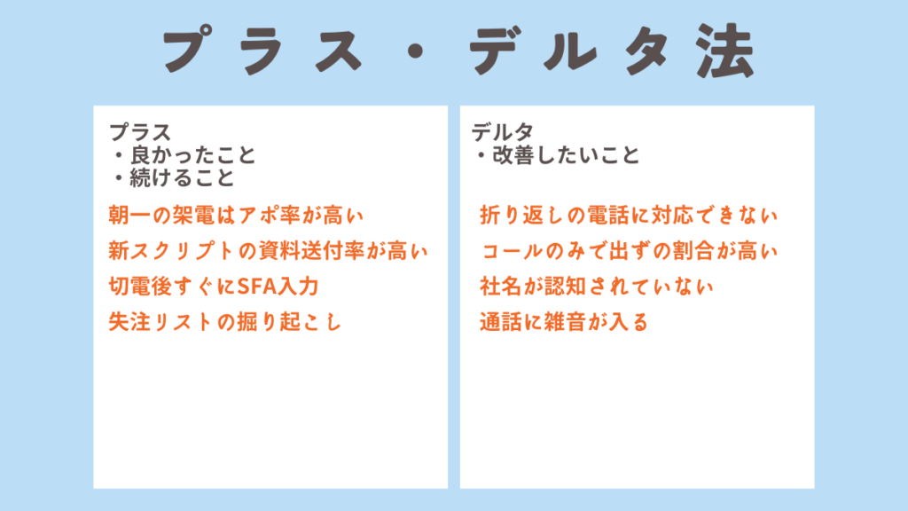 プラス・デルタ法は、プラスの「良かったこと・継続したいこと」とデルタの「改善したいこと」の2つの視点から振り返るフレームワークです。KPT法よりもシンプルなフレームワークなので、より短時間で実施できます。