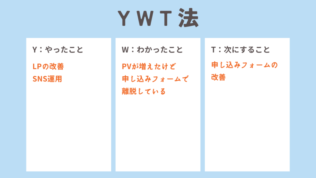 YWT法は日本生まれの振り返りのフレームワークで、「Y:やったこと」「W:わかったこと」「T:次にすること」の頭文字から名前が付けられています。