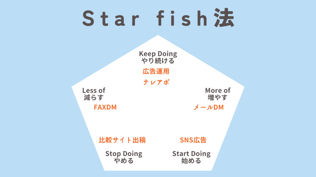 Star fish法は、フレームワークの図形がヒトデ(Star fish)に見えるのが特徴です。以下の5つの項目を書き出し、重要度の高い要素から議論します。