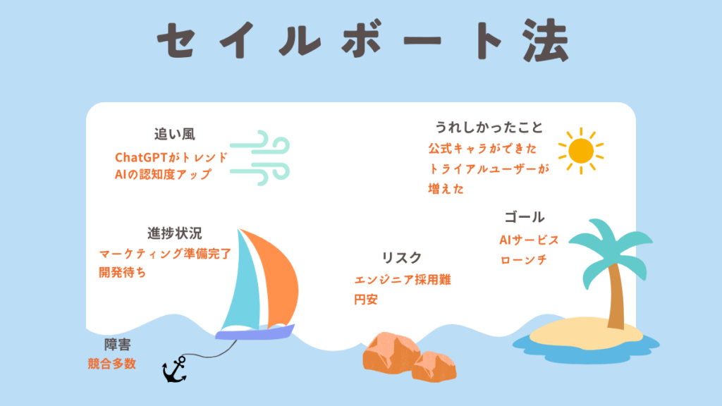 セイルボート法とは、ヨットがゴールの島を目指すイメージで振り返るフレームワークです。視覚的にわかりやすく、チームで和気あいあいと議論できるでしょう。