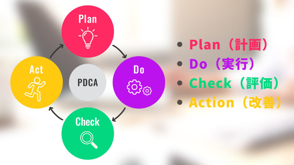 PDCAとは、Plan(計画)→Do(実行)→Check(評価)→Action(改善)の頭文字を取ったもので、これらのプロセスを順番通りに繰り返し行うことで、継続的に改善を行うためのフレームワークです。