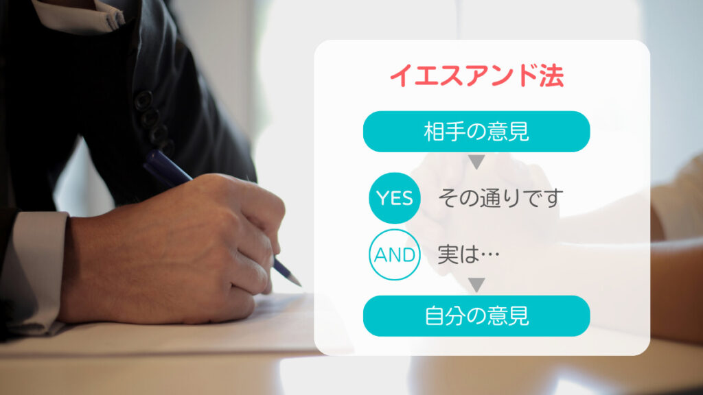イエスアンド法とは、相手の意見を否定する接続詞「しかし」を使用せず、「実は」「そして」のような接続詞を使用して異なる意見を述べる話法です。
