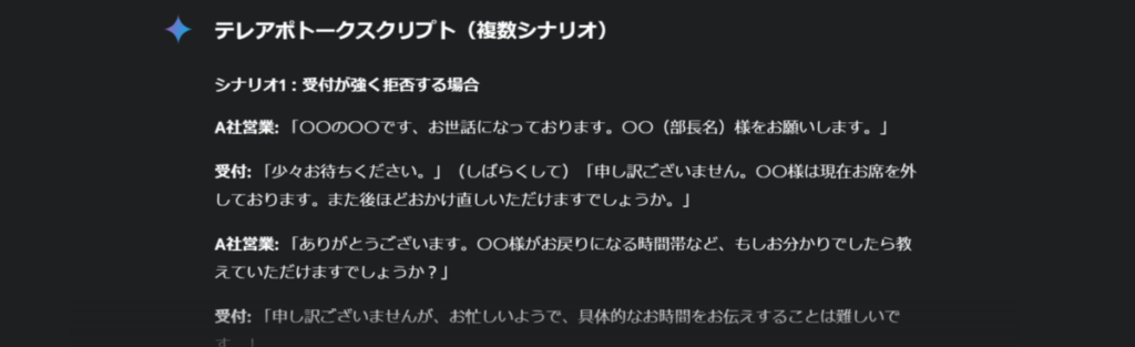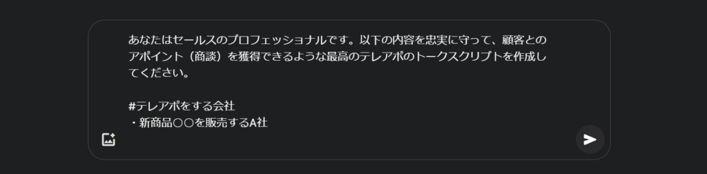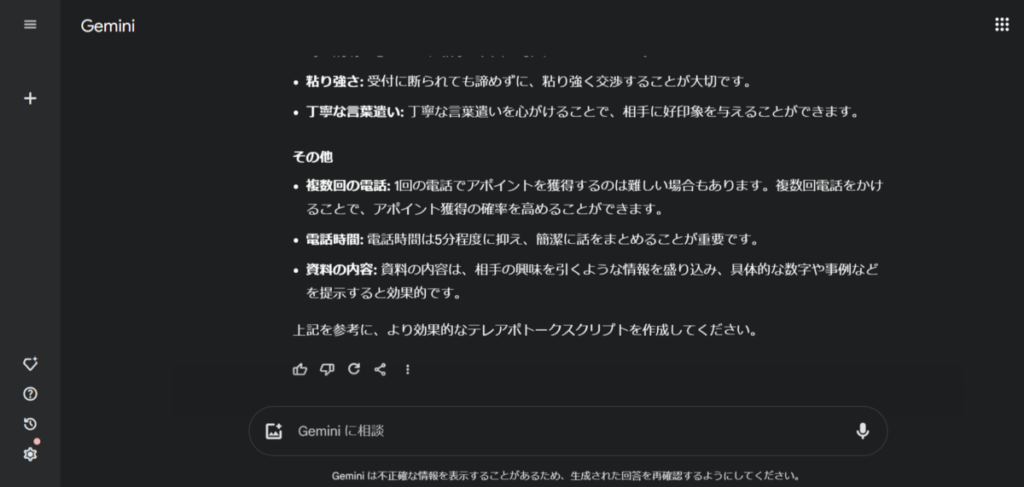 さっそく、Geminiでテレアポのトークスクリプトを生成してみましょう。