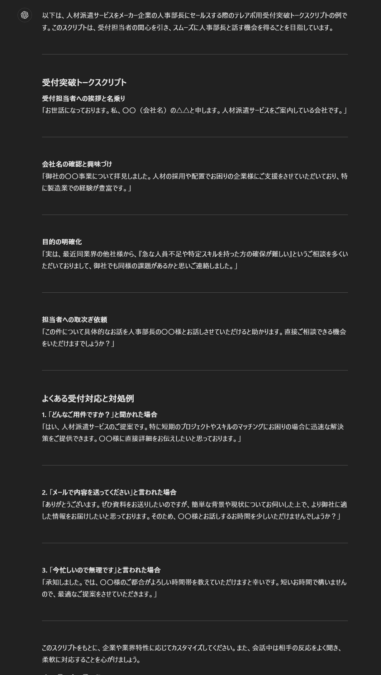 テレアポをする際のトークスクリプトの素案の作成もあっという間に完了します。以下のように質問してみましょう。