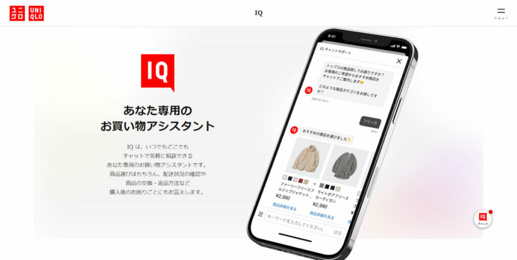 具体的に展開している媒体は、実店舗・ECサイト・アプリです。なかでも特徴的なサービスは「UNIQLO IQ」で、以下のような質問に迅速に回答するAIチャットサービスを提供しています。