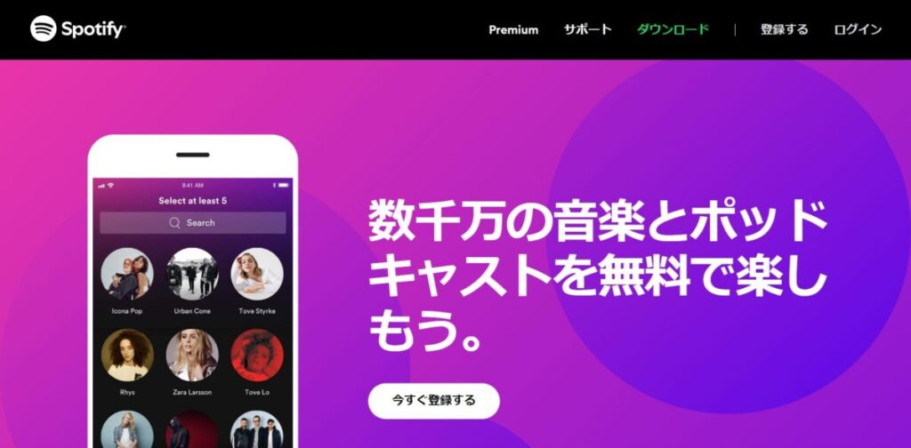 Spotifyは端末を選ばず無料で数千万の音楽とポッドキャストが聴けるサブスクリプションサービスです。